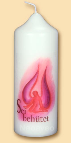 Sei behütet, Kerze mit liebevoll ausgewähltem Engelmotiv. Hergestellt aus Stearin mit speziellen Druckverfahren zum Auftragen der einzelnen Motive.