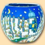 Kerzenglas mit Stadtsilhuette am Abend, Sternen am Himmel. Für Teelicht, Maxi Teelicht, Votivkerze.