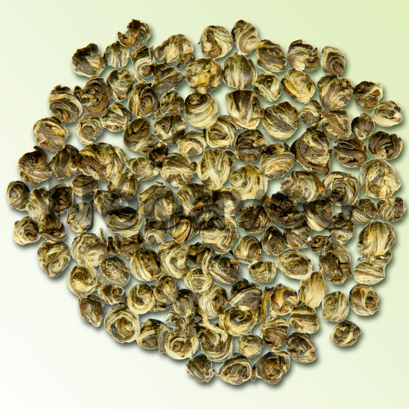 China, feinster Grüntee aus den jüngsten Blättern zur Perlenform gerollt, frische Jasminblüten.