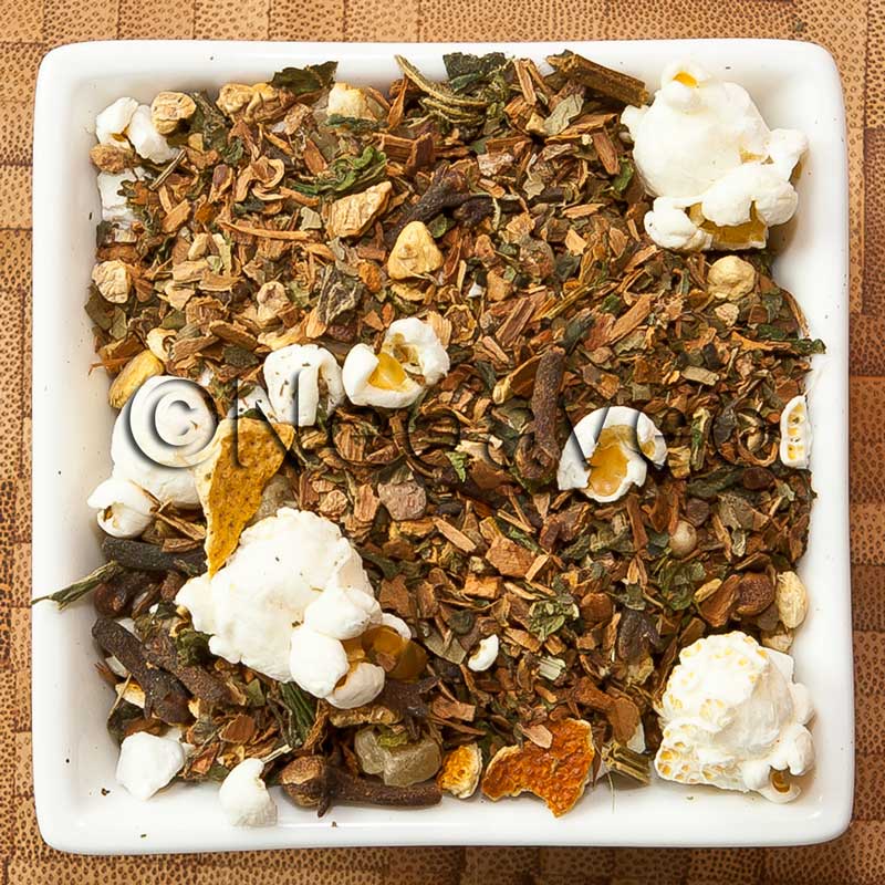 Zimtstücke, Ingwerstücke, Brennnesselblätter, süße Brombeerblätter, Nelken, Ananaswürfel, (Ananas, Zucker), ganzer Kardamom, Orangenschalen, Orangenspalten, Aroma, weißer Pfeffer, Popkorn.